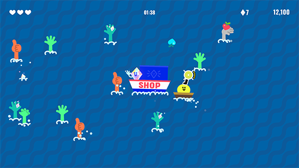 主角是一个拿着枪坐着船的豆子,开枪可以击杀敌人同时产生反作用力推动船,除此之外不能进行其他操作。游戏地图仅仅是一片空白的大海,怪物会随机刷新击杀后掉落金币,商店船隔一段时间会路过来消耗金币换装备,每隔一段时间还会出现天气机制来改变场地,例如全场变黑暗、边缘出现电锯。